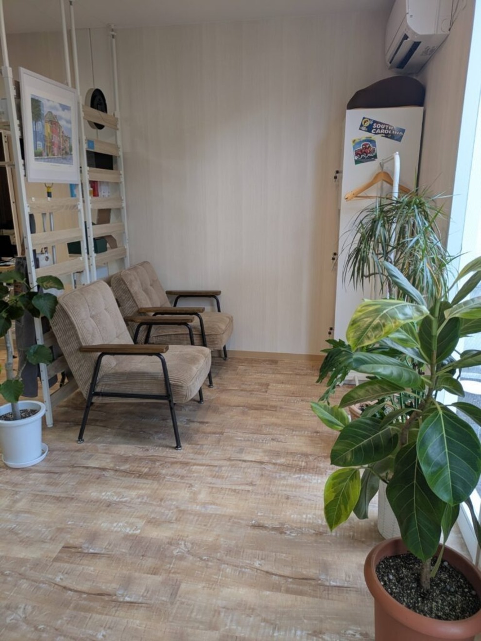 鮮やかなブルーのコンテナをベースに、観葉植物やお洒落なインテリアを配置し、まるでリゾートに来たようなリラックス空間を演出しました。
